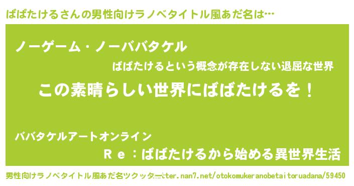 | 女子向けラノベタイトル風あだ名 | 『乙女ゲームの破滅フラグしかない悪役ばばたけるに転生してしまった…』 |