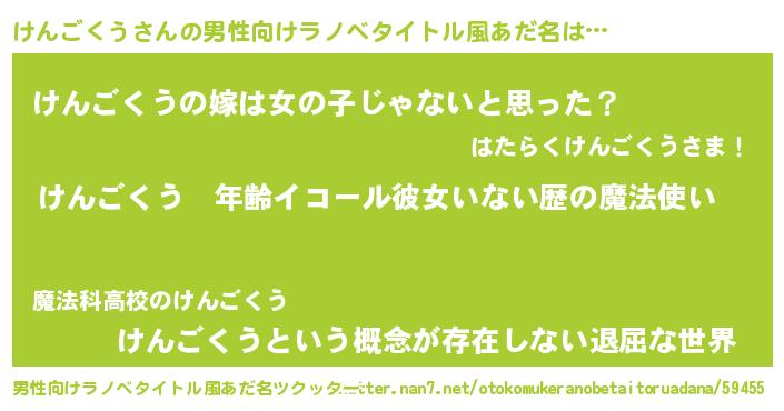 | 女子向けラノベタイトル風あだ名 | 『けんごくうの玉の輿計画!』 |