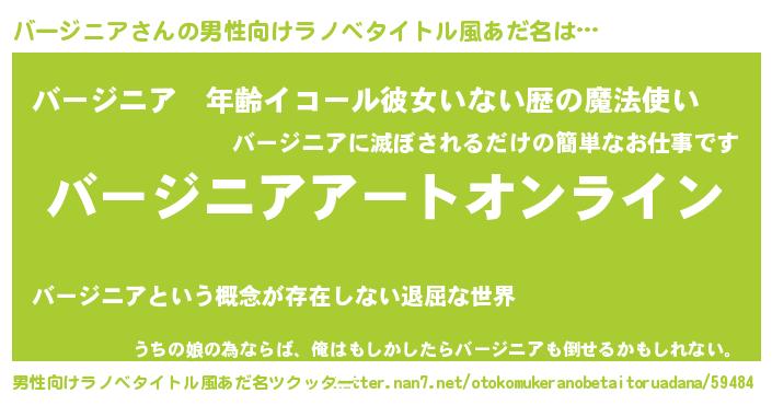 | 女子向けラノベタイトル風あだ名 | 『誰かこのバージニアを説明してください! ~契約から始まるウェディング~』 |