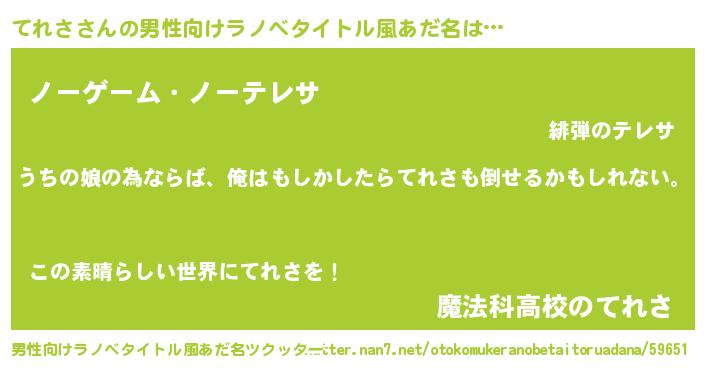 | 女子向けラノベタイトル風あだ名 | 『てれさの婚約者』『死神てれさの再婚』 |