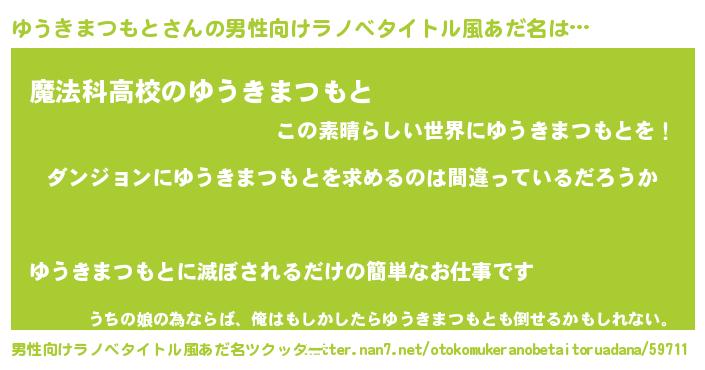 | 胡散臭い通販商品みたいなあだ名 | 『信頼と実績のサプリメント…その名も「ゆうきまつもと」』 |