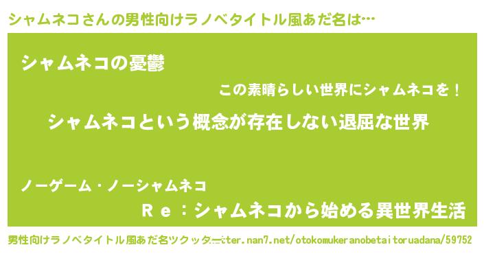 | 胡散臭い通販商品みたいなあだ名 | 『来世でも幸せになれる健康食品…その名も「シャムネコ」』 |