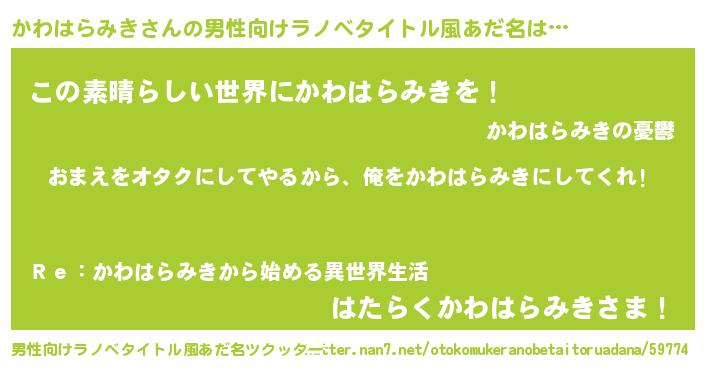 | 女子向けラノベタイトル風あだ名 | 『かわはらみき夫妻のなれそめ』 |