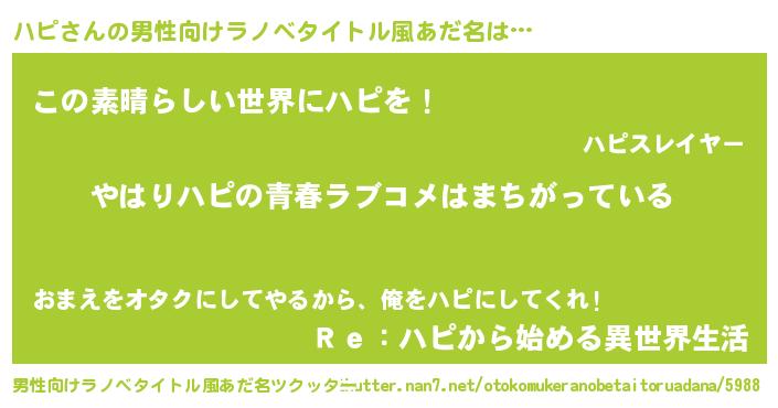| 女子向けラノベタイトル風あだ名 | 『ハピ伯爵の花嫁』『ハピ夫妻のなれそめ』 |