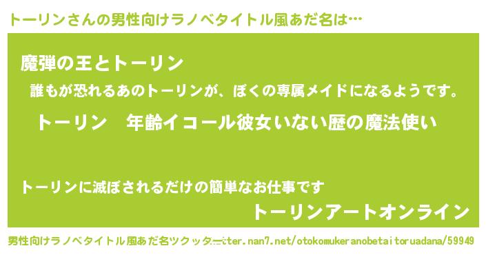 | 女子向けラノベタイトル風あだ名 | 『トーリンの玉の輿計画!』 |