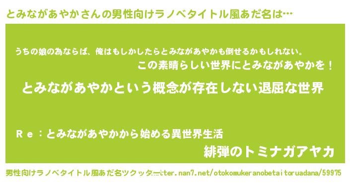 | 女子向けラノベタイトル風あだ名 | 『異世界で失敗しない100のとみながあやか』 |