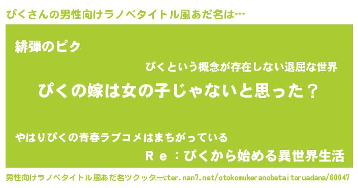 | 女子向けラノベタイトル風あだ名 | 『ぴくの卵を拾いまして』 |