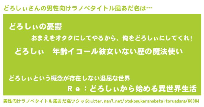 | 女子向けラノベタイトル風あだ名 | 『どろしぃの玉の輿計画!』 |