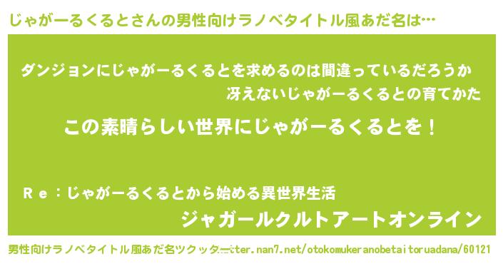 | 胡散臭い通販商品みたいなあだ名 | 『世界中を虜にした100年もののヴィンテージワイン…その名も「じゃがーるくると」』 |