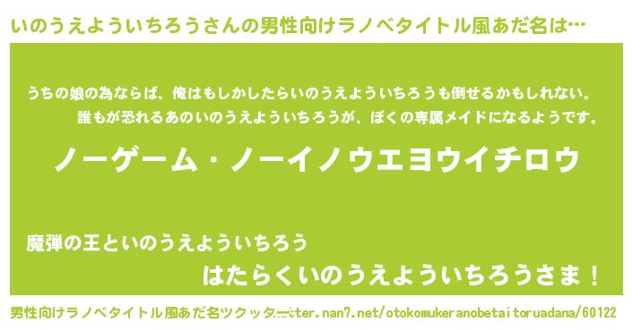 | 女子向けラノベタイトル風あだ名 | 『死神いのうえよういちろうの再婚』 |