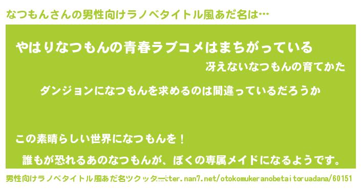 | 女子向けラノベタイトル風あだ名 | 『なつもんの卵を拾いまして』 |
