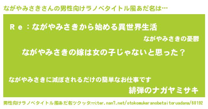 | 女子向けラノベタイトル風あだ名 | 『ながやみさきの卵を拾いまして』 |