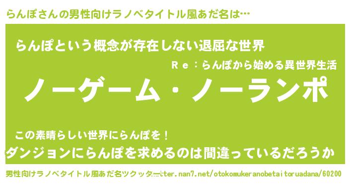 | 女子向けラノベタイトル風あだ名 | 『死神らんぽの再婚』『らんぽの契約王妃』 |
