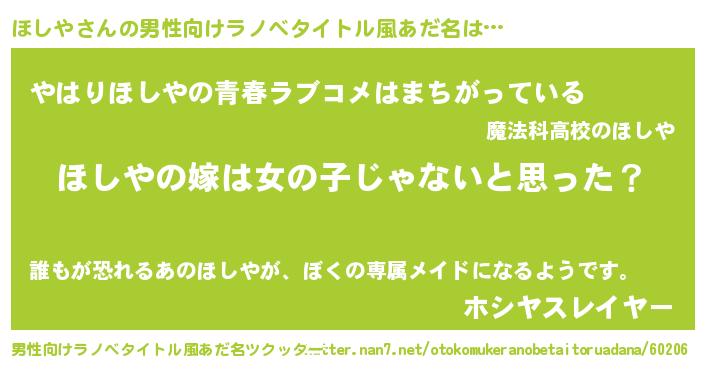 | 女子向けラノベタイトル風あだ名 | 『ほしやの卵を拾いまして』 |