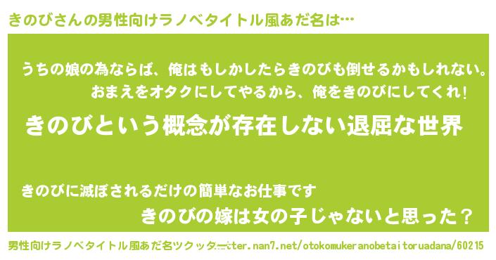 | 女子向けラノベタイトル風あだ名 | 『異世界で失敗しない100のきのび』 |
