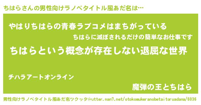 | 女子向けラノベタイトル風あだ名 | 『異世界で失敗しない100のちはら』 |