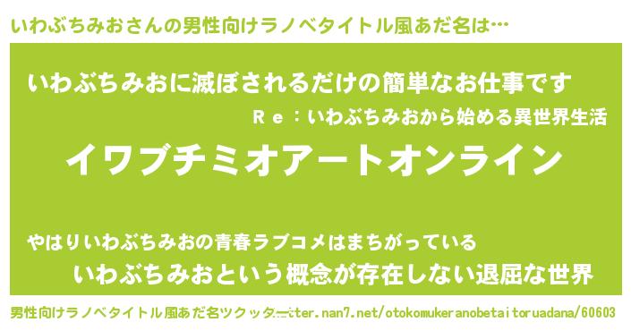 | 胡散臭い通販商品みたいなあだ名 | 『億万長者になれるブレスレット…その名も「いわぶちみお」』 |