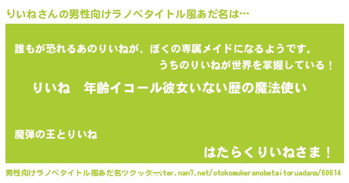 | 女子向けラノベタイトル風あだ名 | 『りいねの玉の輿計画!』 |