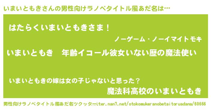 | 女子向けラノベタイトル風あだ名 | 『いまいともきの玉の輿計画!』 |