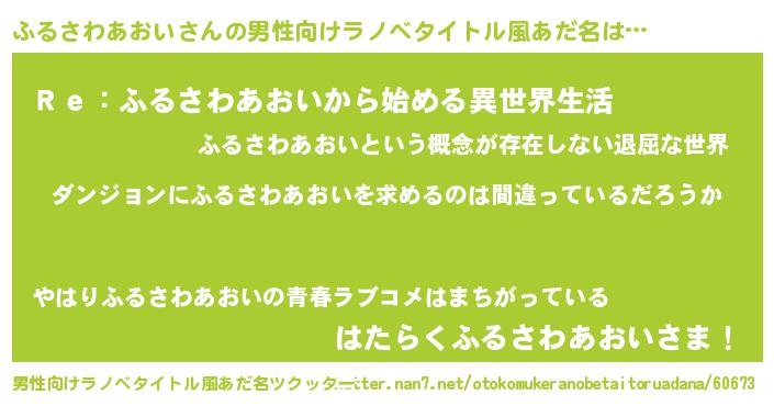 | 女子向けラノベタイトル風あだ名 | 『ふるさわあおいの卵を拾いまして』 |