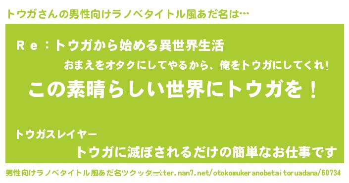 | ヒーロー風カッコイイあだ名 | 『仮面トウダー』『最強戦士トウガ』 |