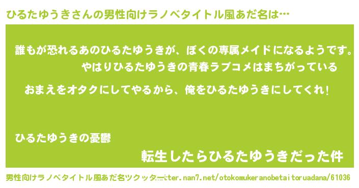 | 女子向けラノベタイトル風あだ名 | 『ひるたゆうき夫妻のなれそめ』 |