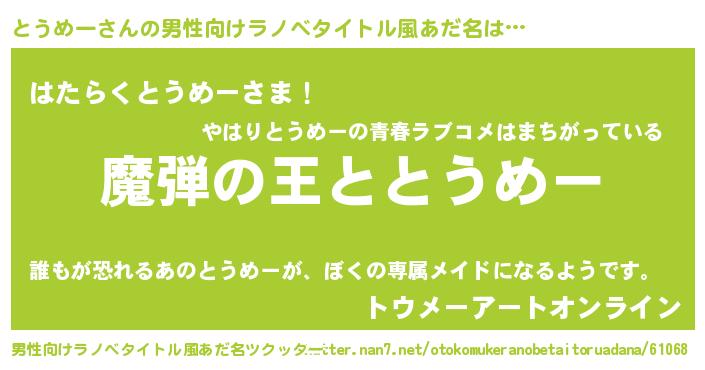 | ヒーロー風カッコイイあだ名 | 『仮面トウダー』『スーパートウメー』 |