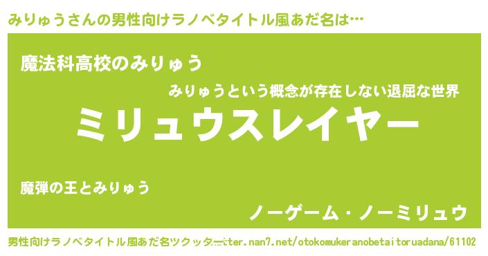 | 肩書あだ名 | 『みりゅう中将』『みりゅう総統』 |