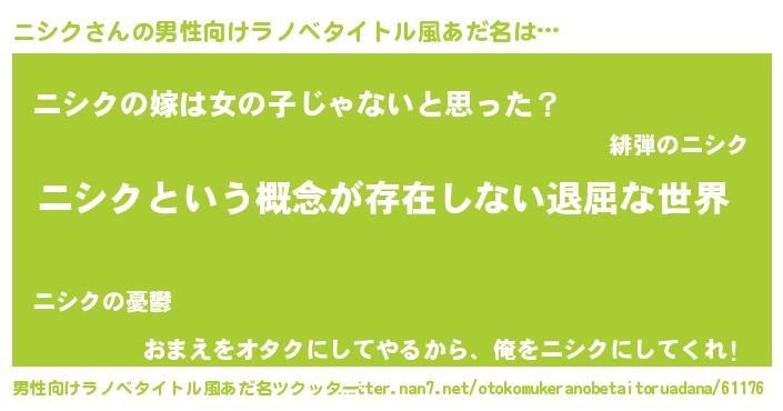 | 女子向けラノベタイトル風あだ名 | 『異世界で失敗しない100のニシク』 |