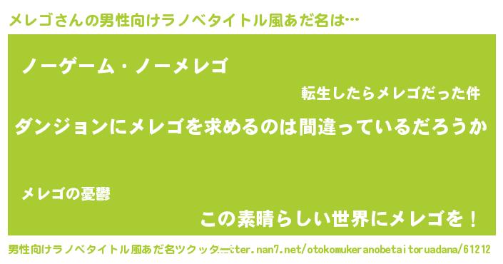 | 女子向けラノベタイトル風あだ名 | 『メレゴは平凡を望む』 |