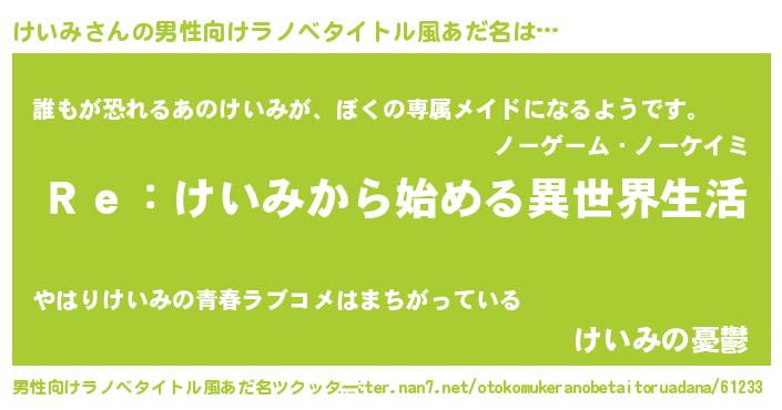 | 女子向けラノベタイトル風あだ名 | 『闇のけいみ』『死神けいみの再婚』 |