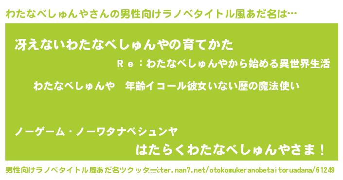| 女子向けラノベタイトル風あだ名 | 『わたなべしゅんやの玉の輿計画!』 |