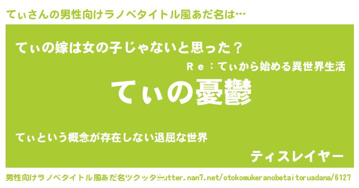| 女子向けラノベタイトル風あだ名 | 『(仮)てぃのやんごとなき事情』 |