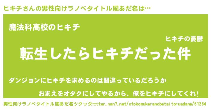 | ヒーロー風カッコイイあだ名 | 『サイバー戦士ヒキチ』『スーパーヒキチ』 |