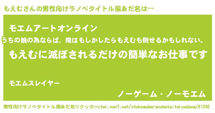 女子向けラノベタイトル風あだ名 | 『横柄もえむと宰相陛下』『もえむ恋絵巻』 |