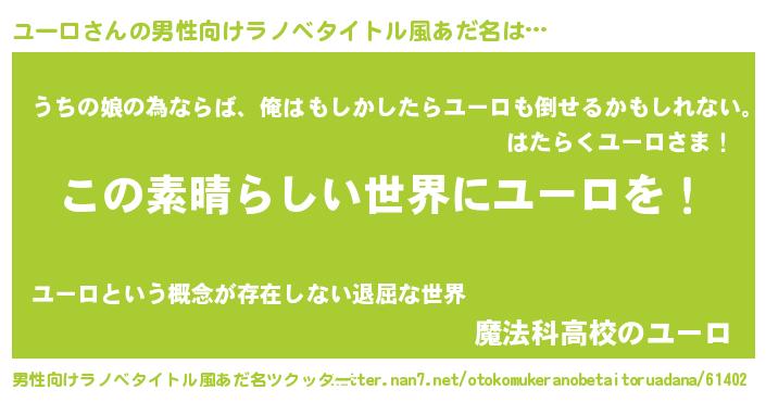 | 女子向けラノベタイトル風あだ名 | 『悪役ユーロに転生したようですが、知った事ではありません』 |