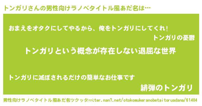 | 胡散臭い通販商品みたいなあだ名 | 『来世でも幸せになれる健康食品…その名も「トンガリ」』 |