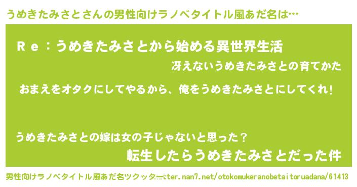 | 女子向けラノベタイトル風あだ名 | 『うめきたみさと夫妻のなれそめ』 |