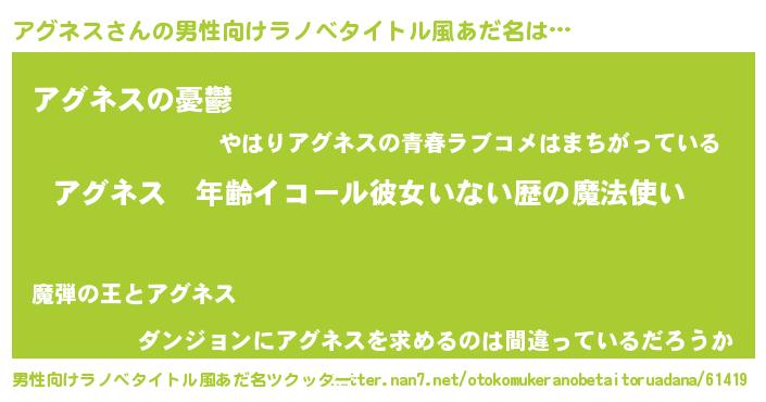 | 女子向けラノベタイトル風あだ名 | 『アグネスの玉の輿計画!』 |