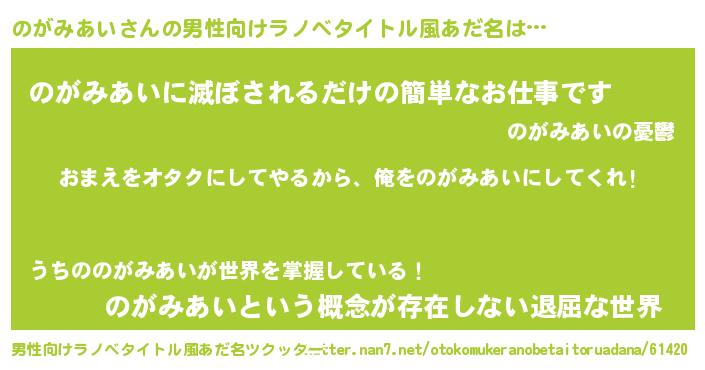 | 女子向けラノベタイトル風あだ名 | 『のがみあい夫妻のなれそめ』 |