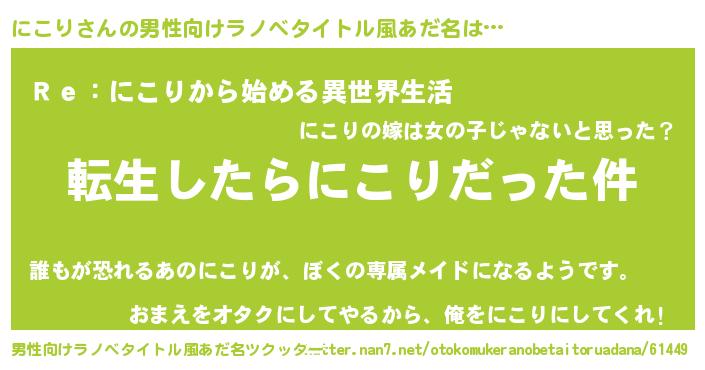 | 女子向けラノベタイトル風あだ名 | 『にこりの玉の輿計画!』 |
