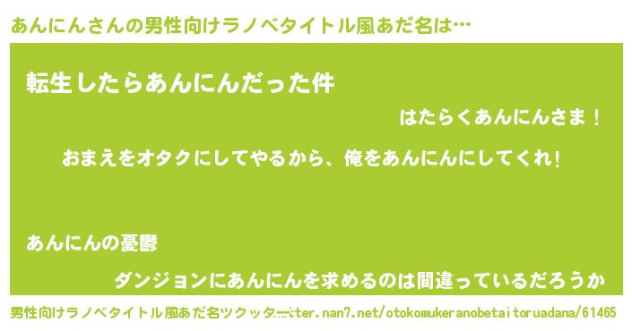 | 女子向けラノベタイトル風あだ名 | 『あんにん夫妻のなれそめ』 |
