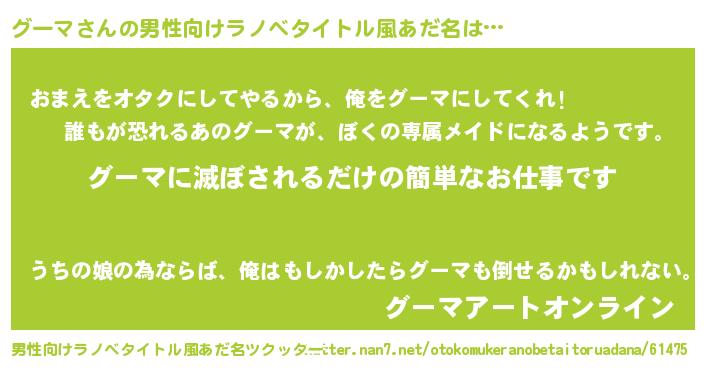 | 女子向けラノベタイトル風あだ名 | 『横柄グーマと宰相陛下』『グーマ恋絵巻』 |