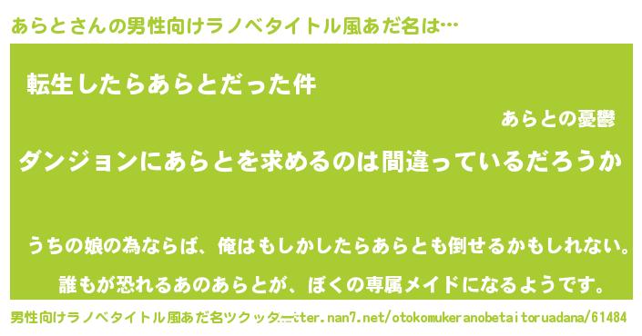 | 女子向けラノベタイトル風あだ名 | 『あらとは平凡を望む』『あらとの婚約者』 |