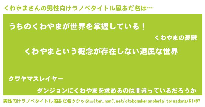 | 女子向けラノベタイトル風あだ名 | 『異世界で失敗しない100のくわやま』 |