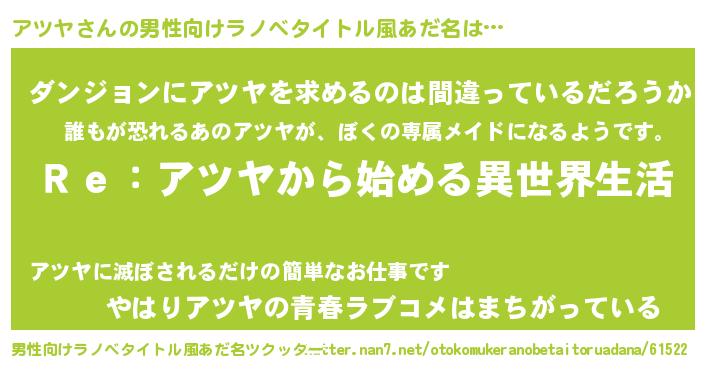 | 女子向けラノベタイトル風あだ名 | 『闇のアツヤ』『アツヤの卵を拾いまして』 |