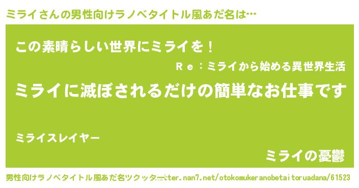 | 胡散臭い通販商品みたいなあだ名 | 『世界中を虜にした100年もののヴィンテージワイン…その名も「ミライ」』 |