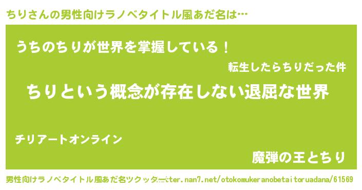 | 女子向けラノベタイトル風あだ名 | 『異世界で失敗しない100のちり』 |