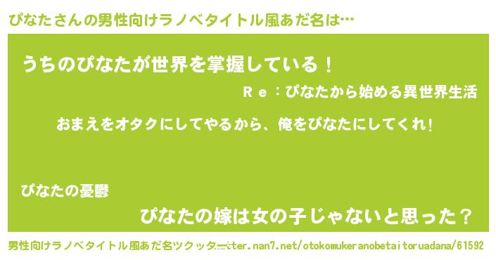 | 女子向けラノベタイトル風あだ名 | 『ぴなた夫妻のなれそめ』『闇のぴなた』 |