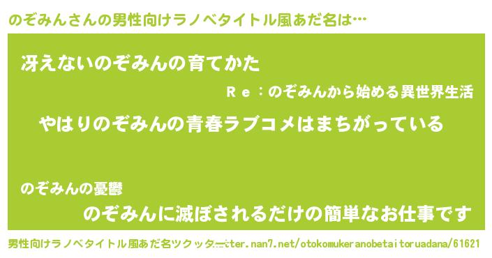 | 女子向けラノベタイトル風あだ名 | 『のぞみんの雑貨屋さん』『闇ののぞみん』 |